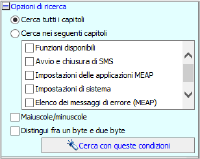 ![]() Le opzioni di ricerca possono essere utilizzate per specificare il capitolo in cui cercare, la sensibilità o meno a maiuscole e minuscole e la differenziazione o meno tra caratteri a un byte e a due byte.