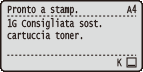 Quando viene visualizzato il messaggio <La cart. toner sta per raggiungere durata prevista.>, la stampa viene temporaneamente interrotta. Per riprendere la stampa, premere