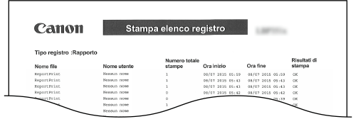 È possibile stampare le impostazioni e un registro di stampa dei rapporti, in formato elenco.