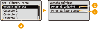 Asterischi (*)Le impostazioni contrassegnate da un asterisco (*) non vengono visualizzate in base ad altre impostazioni e in base all'eventuale installazione dell'alimentatore carta o della scheda SD (tutti elementi opzionali) sulla macchina.