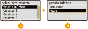Quando l'opzione <Vass. m. carta mista> è impostata su <Attivato>, l'alimentazione preferenziale è il cassetto della carta anche se l'opzione <Prior. vas.multiuso> è impostata su <Attivato>.