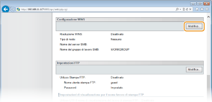Un nome di gruppo di lavoro impostato in [Nome gruppo di lavoro] sotto [Impostazioni SMB] viene automaticamente usato per [Nome del gruppo di lavoro SMB], se presente. Una modifica al nome del gruppo di lavoro in [Nome del gruppo di lavoro SMB] viene applicata anche a [Nome gruppo di lavoro] sotto [Impostazioni SMB].