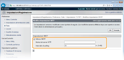 Verifica della comunicazione con il server NTP/SNTPÈ possibile visualizzare lo stato della comunicazione con il server registrato facendo clic su [Impostazioni/Registrazione]