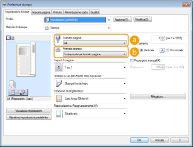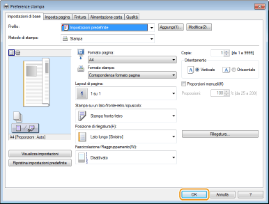 È possibile specificare con semplicità il layout di pagina, la posizione della rilegatura e così via agendo in maniera del tutto intuitiva nell'immagine di anteprima. Per ulteriori informazioni, fare clic su [?] nella schermata del driver stampante.