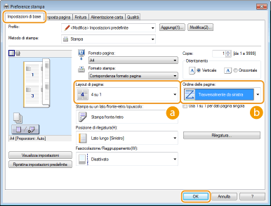 È possibile stampare più pagine su un singolo foglio. Ad esempio, è possibile stampare da quattro a nove pagine su un foglio con l'opzione [4 su 1] o [9 su 1]. Utilizzare questa funzione per risparmiare carta o visualizzare il documento come miniatura.