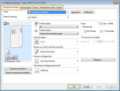 Fare clic sulle schede [Impostazioni di base], [Imposta pagina], [Finitura], [Alimentazione carta] o [Qualità] per specificare le impostazioni di stampa per ogni schermata, in base alle esigenze.