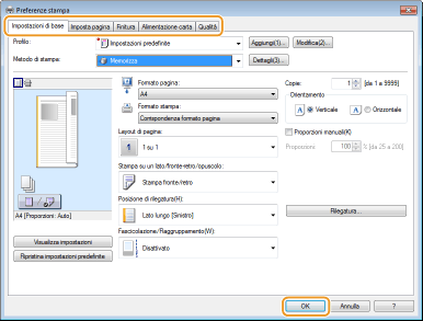 Fare clic sulla scheda [Impostazioni di base], [Imposta pagina], [Finitura], [Alimentazione carta] o [Qualità] per specificare le impostazioni di stampa per ogni schermata, in base alle esigenze.