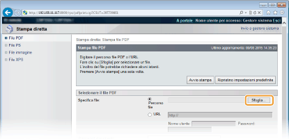 Selezionare [URL] e digitare l'URL del file PDF. Se è prevista l'autenticazione dell'utente, digitare il nome utente e la password.