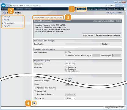 Visualizza la pagina [Monitoraggio stato/Annulla]. È possibile utilizzare questa pagina per controllare lo stato di stampa corrente, annullare l'elaborazione della stampa e visualizzare la cronologia dei lavori di stampa.