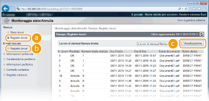 Viene visualizzata la cronologia di massimo 16 e-mail stampate dopo la ricezione (fino a 128 documenti quando è installata la scheda SD).