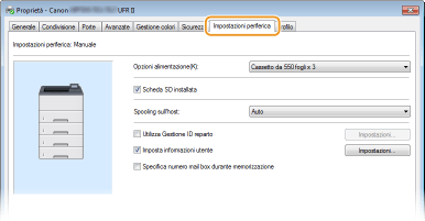 Se si desidera abilitare Gestione ID divisione per la stampa da un computer, è necessario specificare le impostazioni utilizzando i driver installati sul computer. Specificare l'ID e il PIN divisione, secondo le necessità.