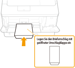 Legen Sie die Briefumschläge hochkant (mit der kurzen Seite zum Gerät hin) und mit der klebstofffreien Seite (Vorderseite) nach unten weisend ein. Sie können die Rückseite von Briefumschlägen nicht bedrucken.