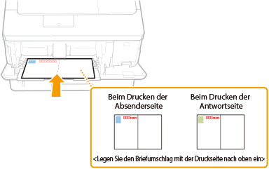 In diesem Abschnitt wird beschrieben, wie Sie Briefumschläge in der gewünschten Ausrichtung einlegen und welche Schritte Sie vor dem Einlegen der Briefumschläge oder Postkarten ausführen müssen. Weitere Einzelheiten bezüglich der allgemeinen Schritte zum Einlegen von Briefumschlägen oder Postkarten in das Mehrzweckfach erhalten Sie unter Einlegen von Papier in das Mehrzweckfach.