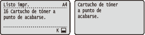 Si aparece el mensaje <Cartucho de tóner a punto de acabarse.>, la impresión se detendrá temporalmente. Para reanudar la impresión, pulse
