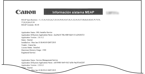 Puede verificar la información sobre las aplicaciones MEAP instaladas en el equipo y las aplicaciones de sistema MEAP en forma de lista si está habilitada la función MEAP.