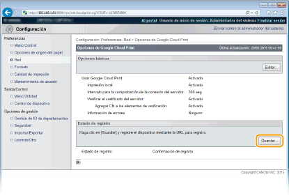 Tendrá que habilitar Google Cloud Print.Haga clic en [Editar], marque la casilla de verificación [Usar Google Cloud Print] y luego haga clic en [Aceptar].