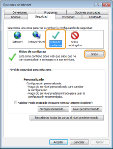 Seleccione [Sitios de confianza] en la pestaña [Seguridad] y haga clic en [Sitios].