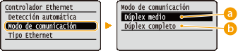 Seleccione <Dúplex medio> o <Dúplex completo> ![]() ![]() <Dúplex medio>Envía y recibe datos de comunicación de forma alternativa. Seleccione cuándo se conecta el equipo a un dispositivo de red utilizando Dúplex medio.