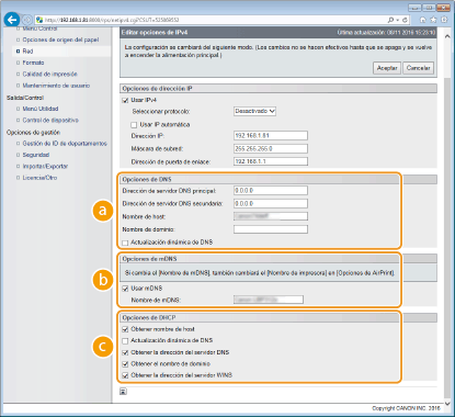 Adoptado por Bonjour, mDNS (DNS multidifusión) es un protocolo para relacionar un nombre de host con una dirección IP sin utilizar DNS. Seleccione la casilla de verificación para activar mDNS e introduzca el nombre de mDNS en el cuadro de texto [Nombre de mDNS] empleando hasta 63 caracteres. Esta casilla de verificación solo se puede seleccionar si está seleccionada la casilla de verificación [Usar IPv4]. [Opciones de DHCP][Obtener nombre de host]