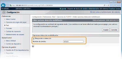 Marque la casilla de verificación para que el equipo responda a los paquetes de detección de multidifusión del software de administración de dispositivos y habilite la supervisión por parte del software de administración de dispositivos. Si no desea configurar el equipo para responder, quite la marca de la casilla de verificación. [Nombre de ámbito]