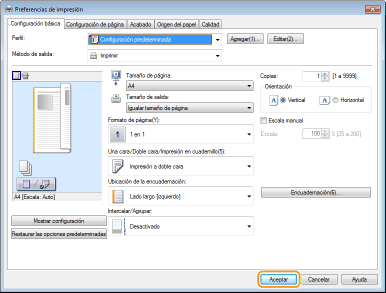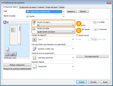 Podrá especificar fácilmente el formato de página, la posición de encuadernación, etc. de una forma intuitiva en la imagen de vista preliminar.Para obtener más información, haga clic en [Ayuda] en la pantalla del controlador de impresora.