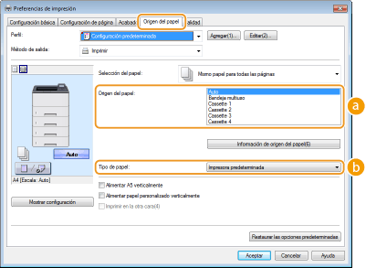 El origen del papel se seleccionará automáticamente en función del tamaño y el tipo de papel especificado para la impresión y las opciones configuradas en el equipo.