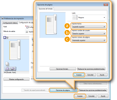 Pestaña [Configuración de página] Haga clic en [Opciones de página] Seleccione la posición de impresión de la fecha de impresión, el nombre de usuario o el número de página [Aceptar]  [Aceptar]