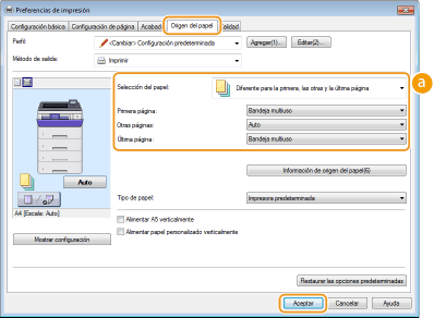 Seleccione las páginas que desee imprimir en un papel diferente y el origen del papel cargado con el papel en [Selección del papel]