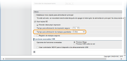 Los datos guardados en la tarjeta SD están configurados de forma predeterminada para eliminarse automáticamente al cabo de tres días. Si desea cambiar el tiempo que la tarjeta SD conserva los documentos o evitar que los documentos se eliminen automáticamente, cambie las opciones desde la IU remota. Los documentos guardados también se pueden eliminar manualmente.
