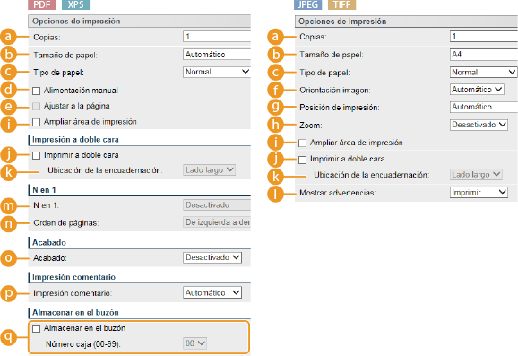 Al especificar las opciones de impresión para archivos XPSDesmarque la casilla de verificación [Priorizar tique de impresión]. Si la casilla de verificación está seleccionada, algunos elementos no estarán disponibles.