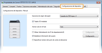 Haga clic en la pestaña [Configuraciones del dispositivo] y especifique las opciones necesarias.