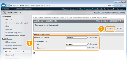 Registre un ID de departamento y establezca un PIN para el mismo. Pueden registrarse hasta 300 ID de departamento.