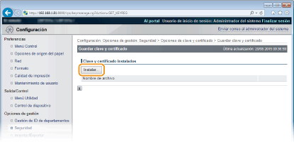 Haga clic en [Opciones de clave y certificado] para instalar un par de claves o en [Opciones de certificado de CA] para instalar un certificado de CA.