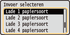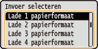 Maak een keuze uit <Lade 1 papiersoort> tot <Lade 4 papierformaat> en druk op