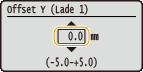 In onderstaand voorbeeld: om de afdrukpositie 5 mm omhoog en 1,7 mm naar rechts te verschuiven, is '-5,0 mm' ingesteld in <Offset Y> en is '+1,70 mm' ingesteld in <Offset X>.