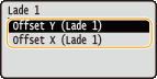 Met <Offset Y (2-zijdig)> en <Offset X (2-zijdig)> kunt u de afdrukpositie op de eerste pagina (voorzijde) instellen. De afdrukpositie op de tweede pagina (achterzijde) wordt ingesteld aan de hand van de waarden die zijn ingesteld voor iedere papierbron.