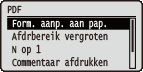 Alle instellingen voor de PDF bestanden die beschikbaar zijn voor USB Direct Print en Direct Print worden in een lijst geplaatst en kort toegelicht. Standaardinstellingen worden aangegeven met een dolksymbool (