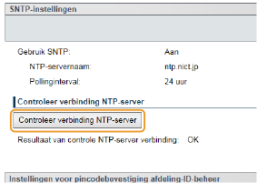 [Netwerk] [TCP/IP-instellingen] en vervolgens te klikken op [Controleer verbinding NTP-server] in [SNTP-instellingen] dat verschijnt. Als een werkende verbinding tot stand is gebracht, wordt dit zoals hieronder aangegeven. Met deze bewerking wordt de systeemklok niet aangepast.![]() Instellingen selecteren vanaf het bedieningspaneelTevens kunt u SNTP-instellingen in- of uitschakelen in het instellingenmenu van het bedieningspaneel. SNTP