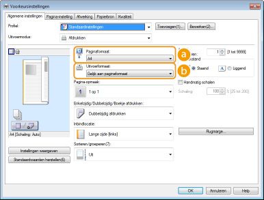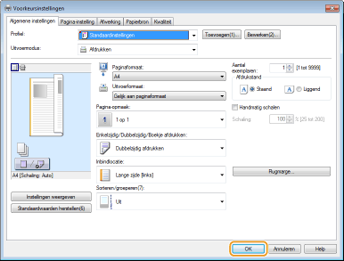 Op de voorbeeldafbeelding kunt u gemakkelijk, op intuïtieve wijze, instellingen zoals de paginalay-out en inbindpositie opgeven. Klik voor meer informatie op [Help] in het scherm van het printerstuurprogramma.