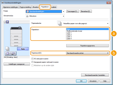 De papierbron wordt automatisch geselecteerd uitgaande van het opgegeven formaat en de opgegeven papiersoort voor het afdrukken en de instellingen die zijn geconfigureerd in het apparaat.