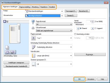 Klik op de tabbladen [Algemene instellingen], [Pagina-instelling], [Afwerking], [Papierbron], of [Kwaliteit] om de afdrukinstellingen op ieder scherm naar behoefte op te geven.