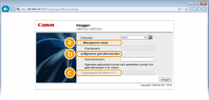 Selecteer [Management-stand] of [Algemene gebruikersmodus].