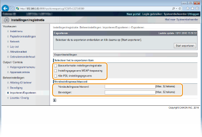 De instellingen van items die in [Instellingen/registratie] op de portaalpagina zijn vastgelegd, kunt u ook exporteren. Hiervoor activeert u de desbetreffende selectievakjes.