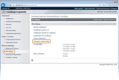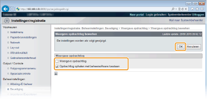 Als u het selectievakje activeert, kunt u software voor apparaatbeheer (zoals imageWARE Enterprise Management Console) gebruiken om een geschiedenis van afdruktaken te verkrijgen. Als u deze beheersoftware wilt uitschakelen, schakelt u het selectievakje uit. Deze functie wordt automatisch ingeschakeld als het selectievakje [Weergave opdrachtlog] is geactiveerd.