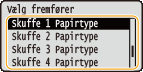 Vælg en af <Skuffe 1 Papirtype> til <Skuffe 4 Papirformat>, og tryk på
