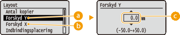 Du kan vælge <Justér printplacer.> under <Brugervedligehold.> til at finjustere udskrivningspositionen for hver papirkilde. Området for de tilgængelige forskydningsværdier er fra -5,0 til +5,0 mm. Justering af udskrivningsposition