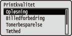 Indstillinger om udskrivningskvalitet, herunder opløsning og tonertæthed, vises med korte beskrivelser. Standardindstillingerne er angivet med en daggert (