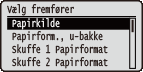 Alle indstillingerne om papirkilde og størrelsen af det format papir, der er lagt i maskinen, vises med korte beskrivelser. Når du trykker på