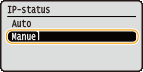 Maskinens IPv4-adresse kan enten tildeles automatisk via en dynamisk IP-adresseringsprotokol, som f.eks. DHCP, eller den kan indtastes manuelt. Hvis maskinen tilsluttes et kabelbaseret LAN, skal du kontrollere, at stikkene på LAN-kablet sættes ordentligt ind i portene (Tilslutning til et kablet LAN).