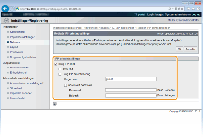 [Brug IPP-autentificering] Marker afkrydsningsfeltet og indstil brugernavn og adgangskode for at bruge brugergodkendelsesfunktionen til IPP-udskrivning. Hvis du ikke bruger dette, skal du fjerne markeringen i afkrydsningsfeltet.